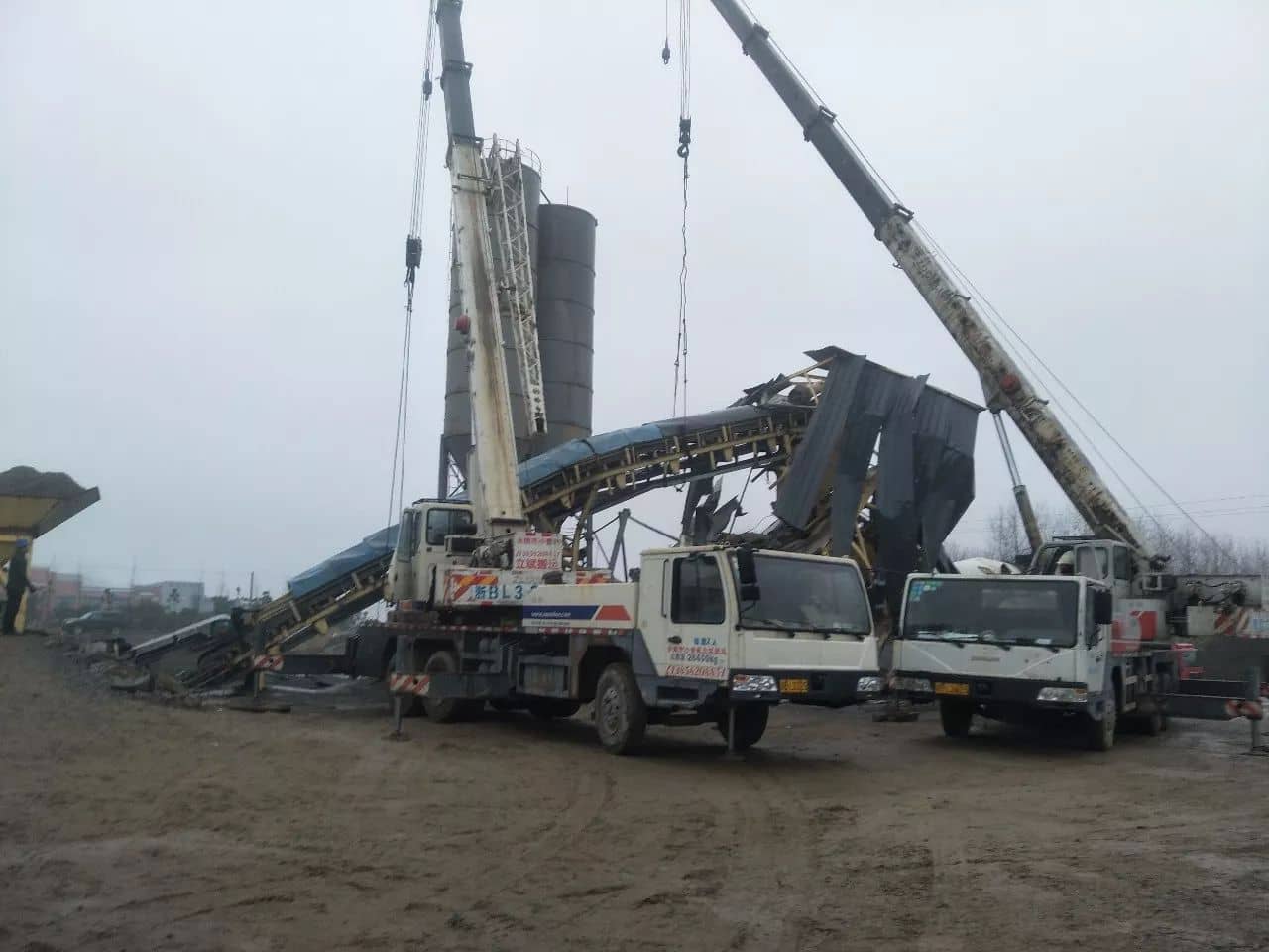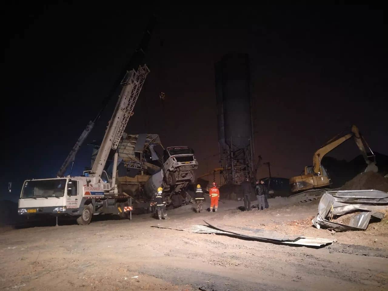 隨后,救援人員立即找來(lái)兩臺(tái)大型吊機(jī),利用吊機(jī)嘗試著把坍塌的水泥罐和散落的鋼板慢慢吊起,在現(xiàn)場(chǎng)人員的指揮下,吊機(jī)開(kāi)始作業(yè)——利用鋼絲繩固定好位置后,慢慢地將罐體向上拉,在兩輛大型的吊機(jī)牽拉下,水泥罐體緩緩地離開(kāi)了地面。