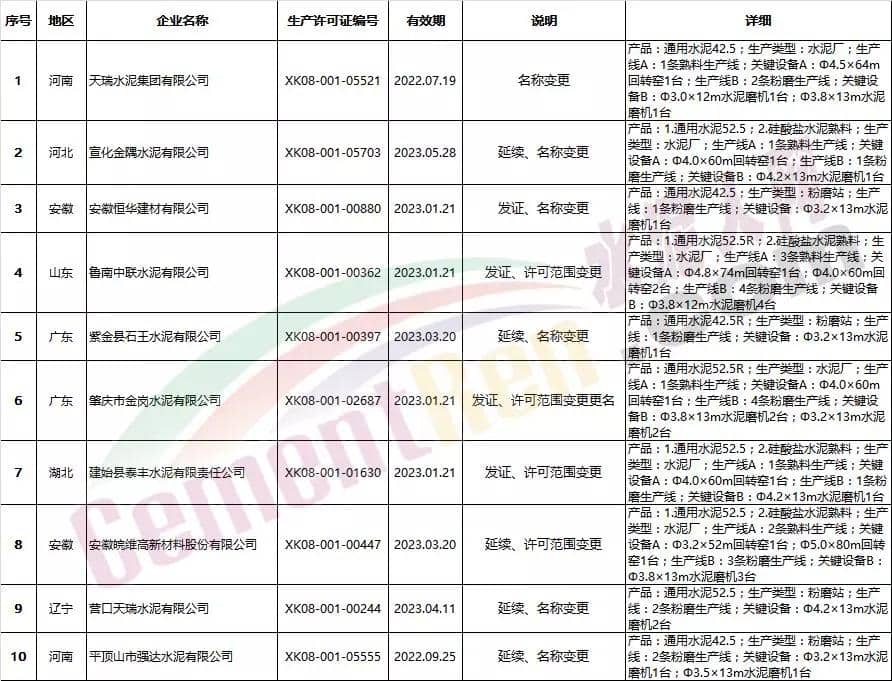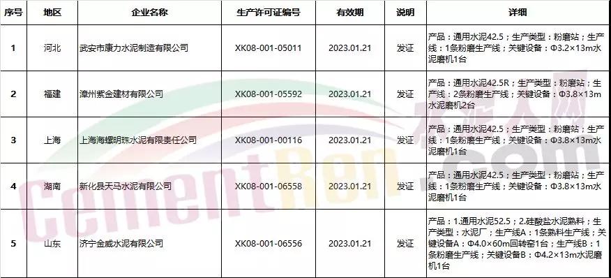 【水泥人網(wǎng)】國家質(zhì)檢總局于本月22日發(fā)放本月第三批生產(chǎn)許可證,本次共發(fā)放25家企業(yè),25個(gè)編號(hào)生產(chǎn)許可證。其中新發(fā)證書五個(gè)編號(hào),涉及名稱及許可范圍變更的共十個(gè)編號(hào)證書,到期延續(xù)的共八個(gè)編號(hào)證書,其他或兼并重組的2個(gè)編號(hào)證書。詳情如下: