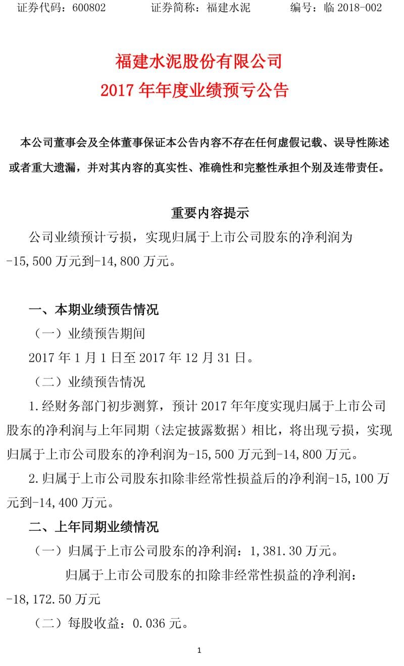 【水泥人網(wǎng)】1月30日,福建水泥(600802)發(fā)布業(yè)績預(yù)告,公司預(yù)計(jì)2017年1-12月歸屬上市公司股東的凈利潤-1.55億至-1.48億,同比變動(dòng)-1222.13%至-1171.45%,建筑材料行業(yè)平均凈利潤增長率為69.21%。