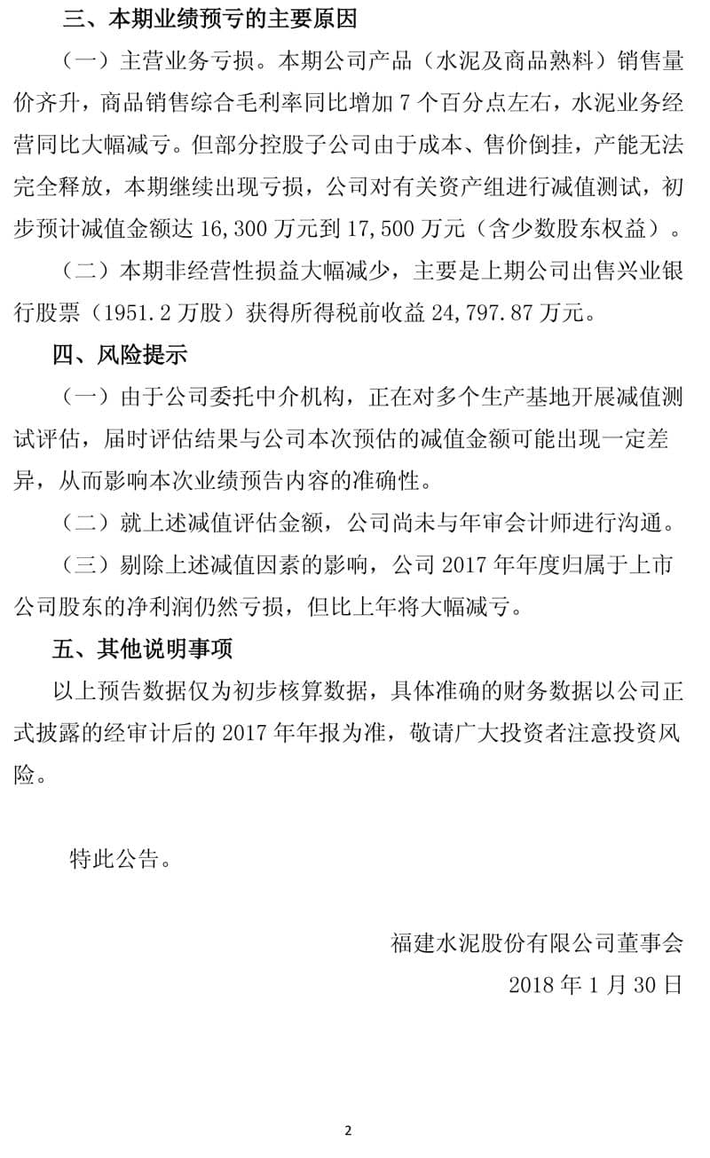 (一)主營業(yè)務(wù)虧損。本期公司產(chǎn)品(水泥及商品熟料)銷售量價(jià)齊升,商品銷售綜合毛利率同比增加7個(gè)百分點(diǎn)左右,水泥業(yè)務(wù)經(jīng)營同比大幅減虧。但部分控股子公司由于成本、售價(jià)倒掛,產(chǎn)能無法完全釋放,本期繼續(xù)出現(xiàn)虧損,公司對(duì)有關(guān)資產(chǎn)組進(jìn)行減值測(cè)試,初步預(yù)計(jì)減值金額達(dá)16,300萬元到17,500萬元(含少數(shù)股東權(quán)益)。