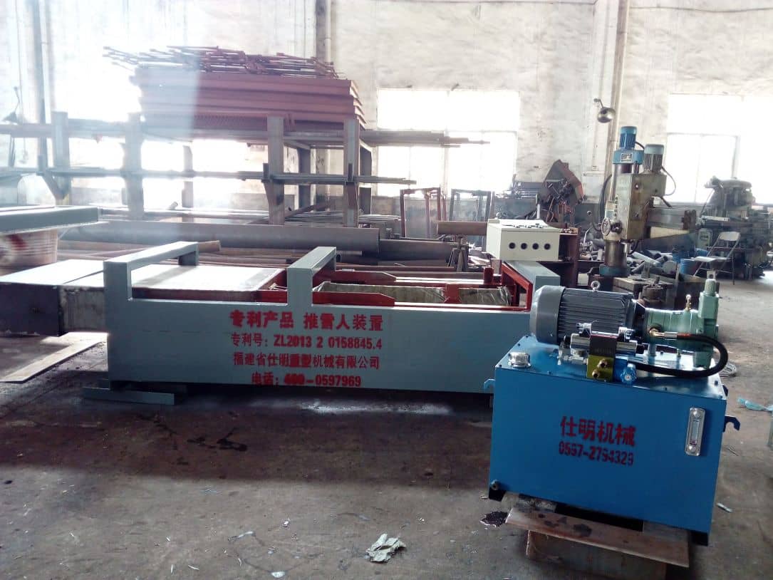 據(jù)王總介紹,SM 型推雪人機主要由耐熱不銹鋼推頭,行走導向機構(gòu),液壓缸,稀油站,密封裝置和位置控制開關(guān)等幾大部件組成。工作原理:當篦冷機需要清除其中的堆積料時,液壓缸啟動工作,帶動推頭前行,推翻“雪人”—把“根”推掉。清除完畢后,接觸到前行程開關(guān)液壓缸啟動回程,推頭回位遇后行程開關(guān)停止工作。