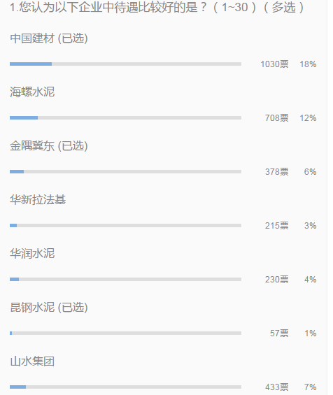 2017年12月15日,水泥人網(wǎng)發(fā)起“您認(rèn)為以下企業(yè)中待遇比較好的是?”民調(diào)活動(dòng),通過7天的網(wǎng)絡(luò)投票,武安新峰水泥以1162票勝出,據(jù)了解,武安新峰水泥每月工資按時(shí)足額發(fā)放,武安新峰不僅是花園式的企業(yè),也是工資加管理的一流企業(yè),福利高,還有機(jī)會(huì)出國??梢钥闯鰡T工對(duì)企業(yè)的信賴度之高,為這家企業(yè)點(diǎn)贊。