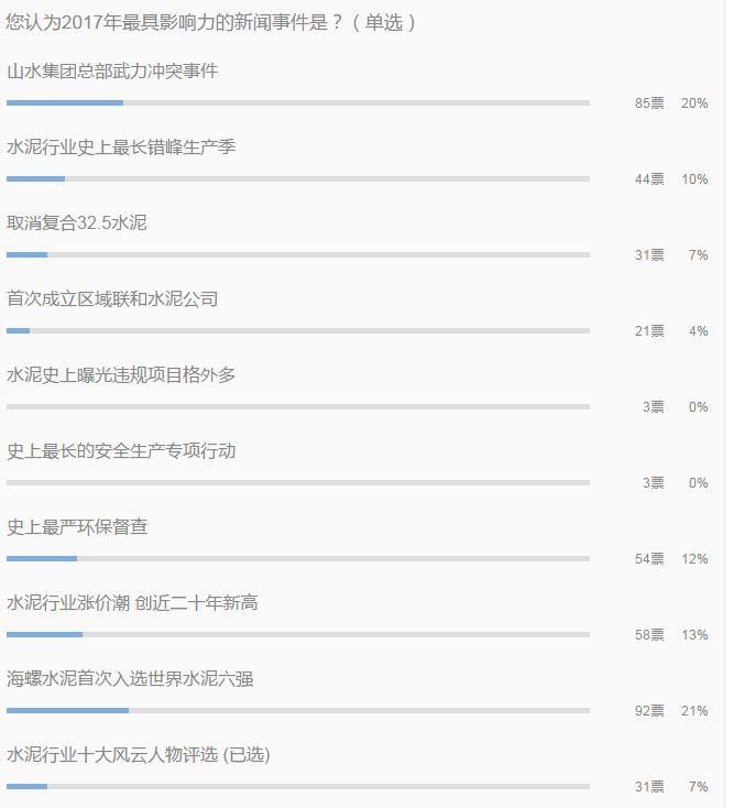 回顧2017年,水泥企業(yè)發(fā)生過很多大事,水泥人網(wǎng)作為水泥行業(yè)最大的新媒體平臺(tái),曾于2017年12月29日帶大家一起回顧了2017年水泥行業(yè)十大新聞事件,并在文末進(jìn)行了“您認(rèn)為2017年最具影響力的新聞事件是?”民調(diào)。在為期7期的民調(diào)中,海螺水泥首次入選世界水泥六強(qiáng)成為水泥行業(yè)最具影響力的新聞事件。