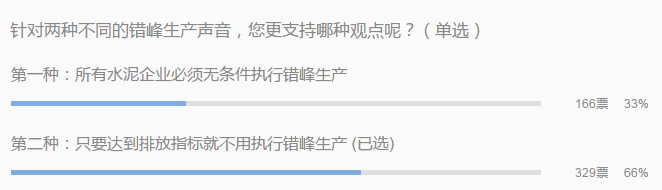 但是在水泥人網(wǎng)針對(duì)兩種不同聲音的民調(diào)結(jié)果顯示,大部分人認(rèn)為只要排放達(dá)標(biāo)可不執(zhí)行錯(cuò)峰生產(chǎn)更符合行業(yè)的發(fā)展,避免水泥行業(yè)出現(xiàn)吃大鍋飯的現(xiàn)象,更能有效的提升各大水泥企業(yè)的節(jié)能減排,達(dá)到真正的綠色發(fā)展。