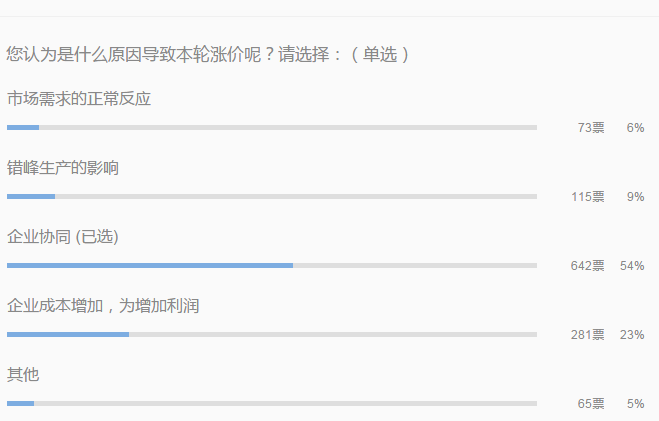 從水泥人網(wǎng)的的民調(diào)來看,大部分人認(rèn)為企業(yè)協(xié)同的作用相比較大,從晉冀魯豫四省C12+4,到遼寧和淄博兩大聯(lián)合水泥集團(tuán)的成立,都對(duì)全國水泥價(jià)格的上漲起到了助推作用。