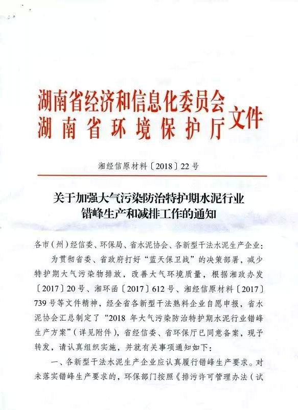 【水泥人網(wǎng)】日前,湖南省經(jīng)信委、環(huán)保廳聯(lián)合發(fā)布《關(guān)于加強(qiáng)大氣污染防治特護(hù)期水泥行業(yè)錯(cuò)峰生產(chǎn)和減排工作的通知》。通知稱根據(jù)省政府相關(guān)政策文件經(jīng)全省各新型干法熟料企業(yè)自愿申報(bào),湖南省水泥協(xié)會(huì)匯總制定了“2018年大氣污染防治特護(hù)期水泥行業(yè)錯(cuò)峰生產(chǎn)方案”。