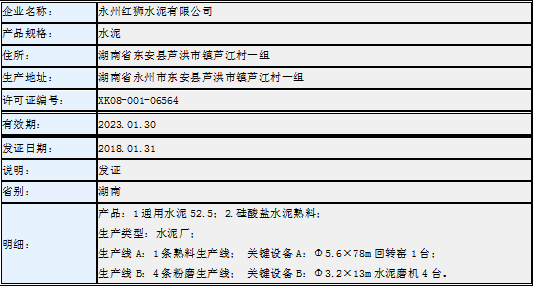 日前,水泥人網(wǎng)從國家質(zhì)檢總局獲悉,永州紅獅水泥已于今年1月底取得生產(chǎn)許可證。