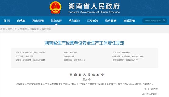 2月27日上午,湖南省發(fā)布了《湖南省生產(chǎn)經(jīng)營單位安全生產(chǎn)主體責任規(guī)定》。標志著從3月1日起,將開始實行企業(yè)生產(chǎn)經(jīng)營單位負責人安全責任終身追究制度。