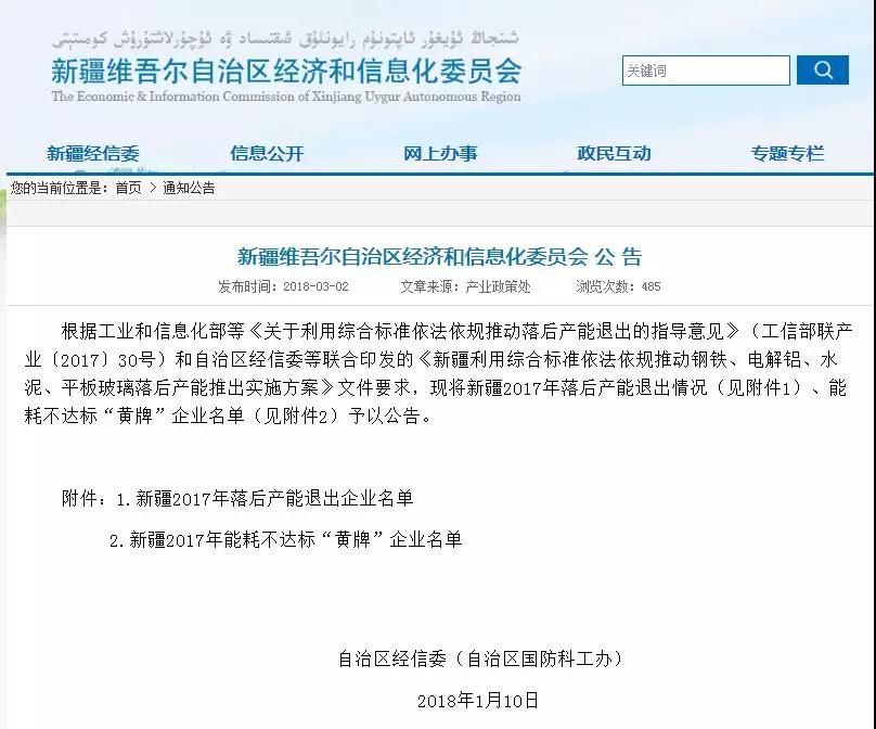 【水泥人網(wǎng)】日前,新疆維吾爾自治區(qū)經(jīng)濟和信息化委員會發(fā)布公告,公告稱根據(jù)工業(yè)和信息化部等《關(guān)于利用綜合標(biāo)準(zhǔn)依法依規(guī)推動落后產(chǎn)能退出的指導(dǎo)意見》(工信部聯(lián)產(chǎn)業(yè)〔2017〕30號)和自治區(qū)經(jīng)信委等聯(lián)合印發(fā)的《新疆利用綜合標(biāo)準(zhǔn)依法依規(guī)推動鋼鐵、電解鋁、水泥、平板玻璃落后產(chǎn)能推出實施方案》文件要求,將新疆2017年落后產(chǎn)能退出情況、能耗不達(dá)標(biāo)“黃牌”企業(yè)名單予以公告。