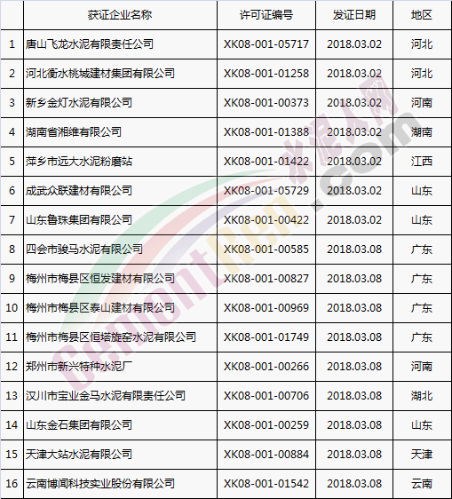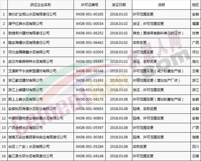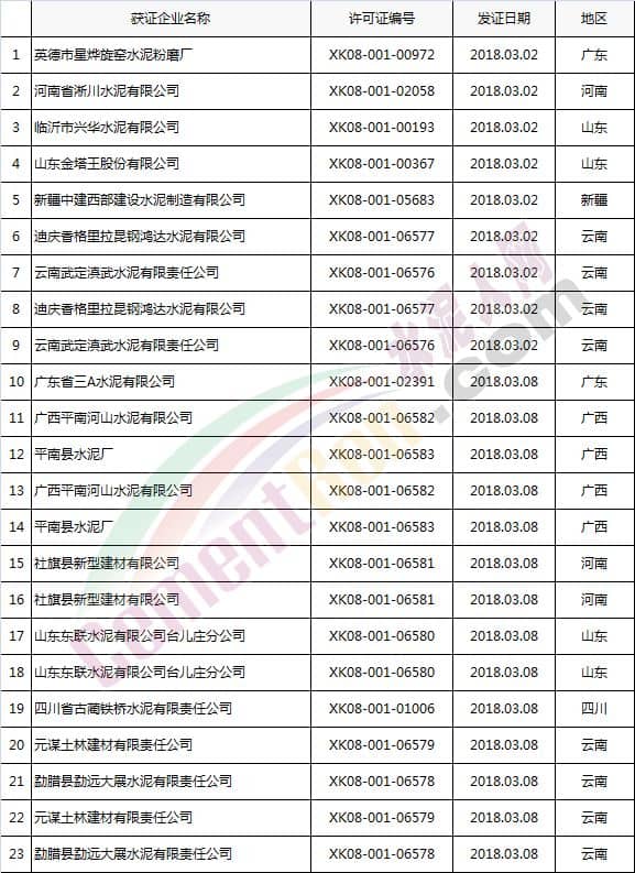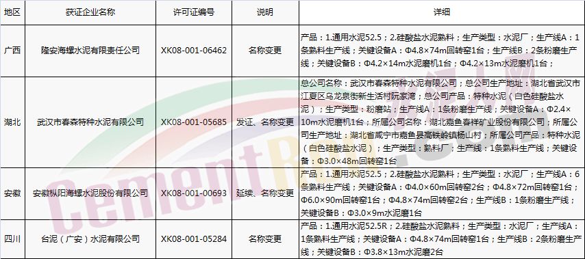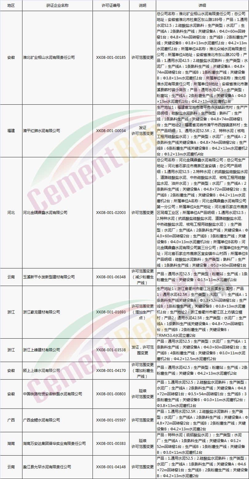 【水泥人網(wǎng)】國(guó)家質(zhì)檢總局于本月2日、8日分別放發(fā)本月第1批和批2批水泥企業(yè)生產(chǎn)許可證。其中涉及新發(fā)證書的23家,涉及到期延續(xù)的16家企業(yè),涉及變更的16家企業(yè)。