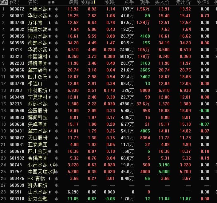 【水泥人網(wǎng)】水泥漲價(jià)信息輪番來襲,河北、陜西、遼寧、四川、重慶新疆等地大幅調(diào)漲,水泥板塊午后強(qiáng)勢拉升,龍頭萬年青漲超7%,海螺水泥、上峰水泥、華新水泥、同力水泥等紛紛跟漲。