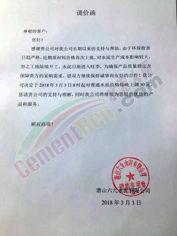 3月3日唐山六九水泥有限公司發(fā)調(diào)價(jià)函稱,由于環(huán)保檢查日趨嚴(yán)格,近期原材料價(jià)格再度上漲,對水泥生產(chǎn)成本影響較大,加之工地陸續(xù)開工,水泥日漸進(jìn)入旺季,為確保產(chǎn)品質(zhì)量穩(wěn)定及保障下游客戶采購需求,公司決定對普通水泥價(jià)格上調(diào)30元/噸。