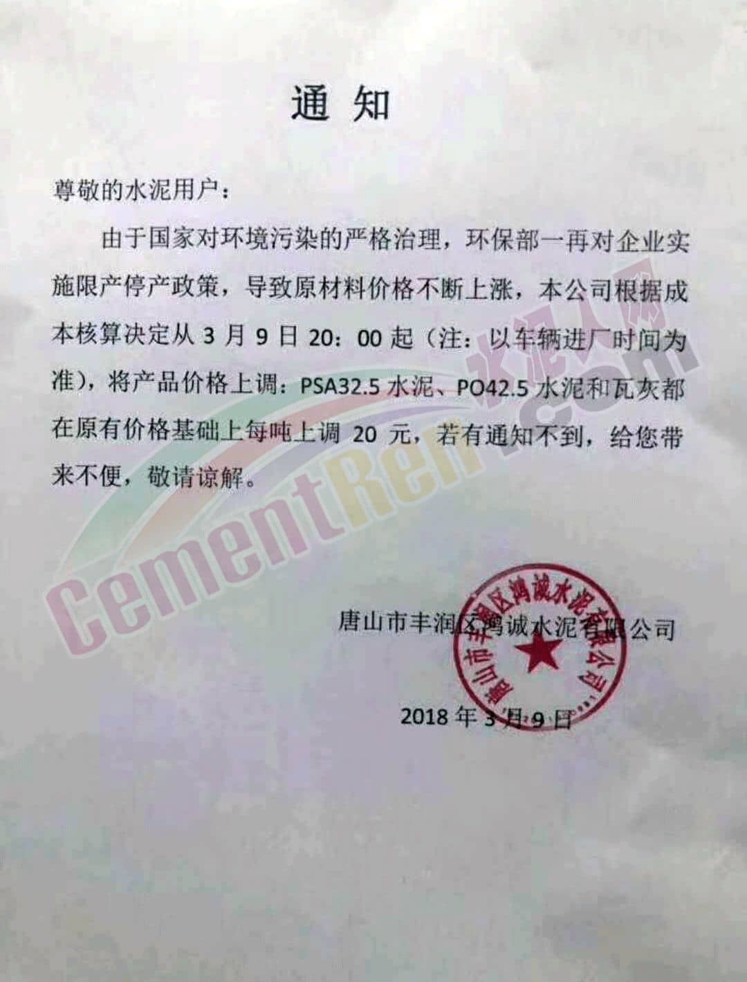 3月9日唐山市豐潤區(qū)鴻誠水泥有限公司發(fā)布通知稱由于國家對環(huán)境污染的嚴(yán)格治理,環(huán)保部一再對企業(yè)實(shí)施限產(chǎn)停產(chǎn)政策,導(dǎo)致原材料價(jià)格不斷上漲,公司根據(jù)成本核算決定自3月9日20:00起水泥價(jià)格在原有價(jià)格基礎(chǔ)上上調(diào)20元/噸。
