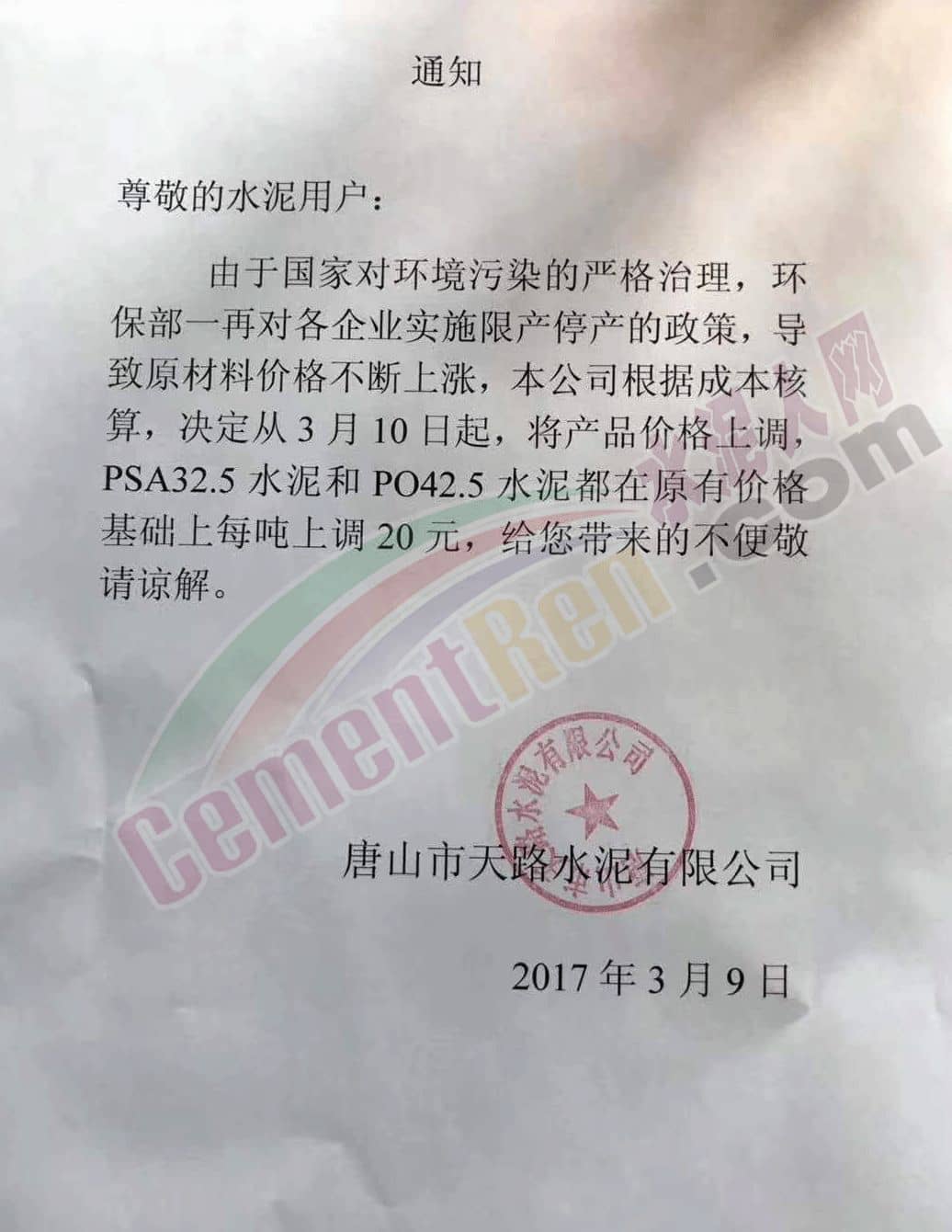 唐山天路水泥有限公司通知,自3月10日起上調(diào)PSA32.5和PO42.5水泥價(jià)格20元/噸。