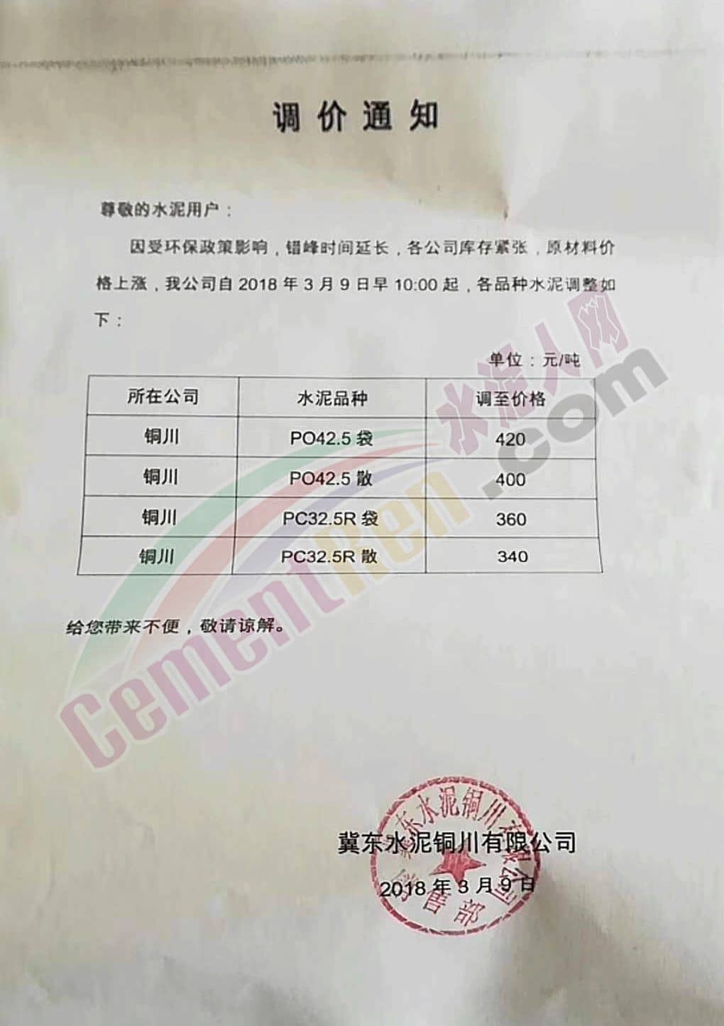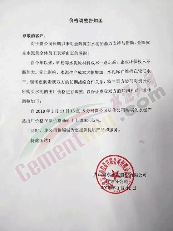 3月12日唐山區(qū)域龍頭企業(yè)唐山冀東水泥股份有限公司發(fā)出價(jià)格調(diào)整告知函,告知下游客戶因礦粉等原材料成本一路走高,企業(yè)環(huán)保投入不斷加大,水泥生產(chǎn)成本增加,水泥庫存維持在較低水平,為保證正常的銷售供應(yīng)自3月13日起各標(biāo)號水泥出廠價(jià)上調(diào)50元/噸。
