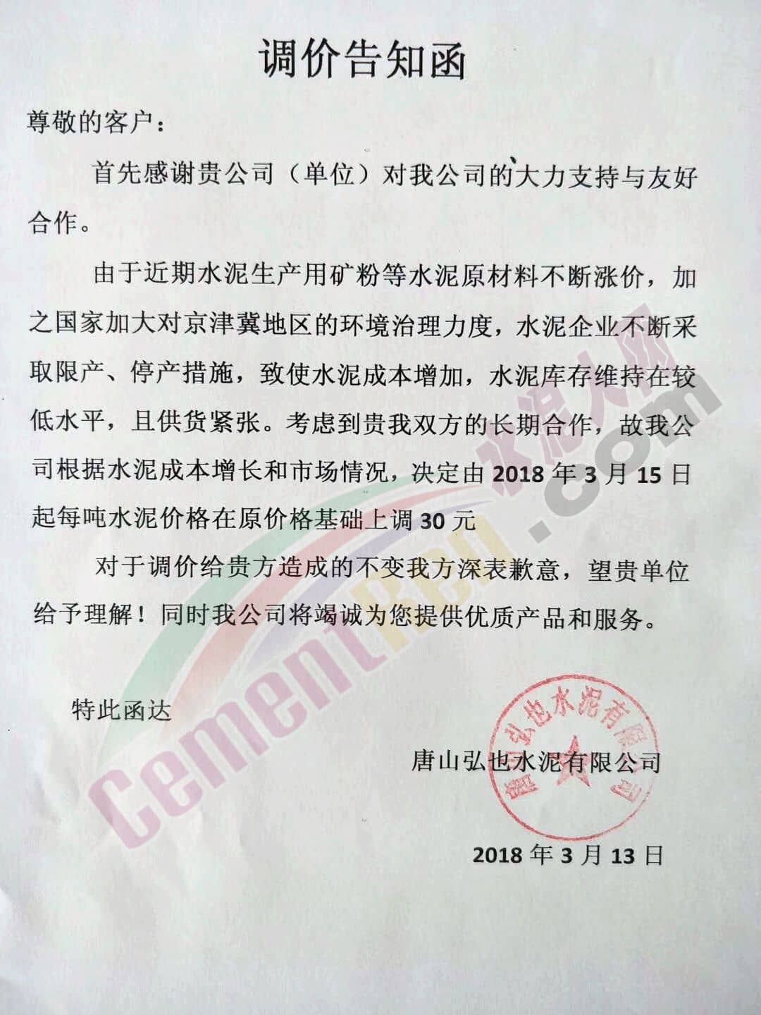 3月13日,唐山弘也水泥發(fā)布調(diào)價(jià)通知,決定自3月15日起每噸水泥價(jià)格在原價(jià)格基礎(chǔ)上上調(diào)30元/噸。