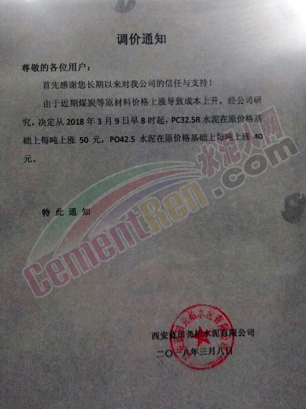 3月8日西安藍(lán)田堯柏水泥有限公司通知自3月9日8時(shí)起PC32.5R水泥上調(diào)50元/噸,PO42.5水泥上調(diào)40元/噸。