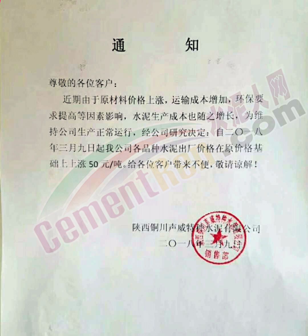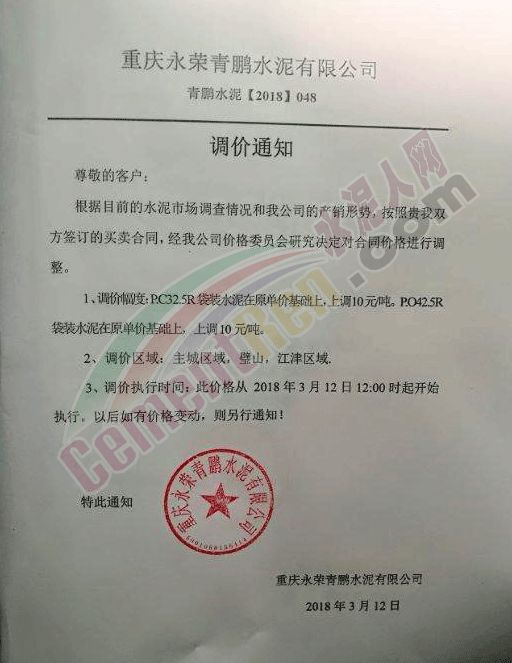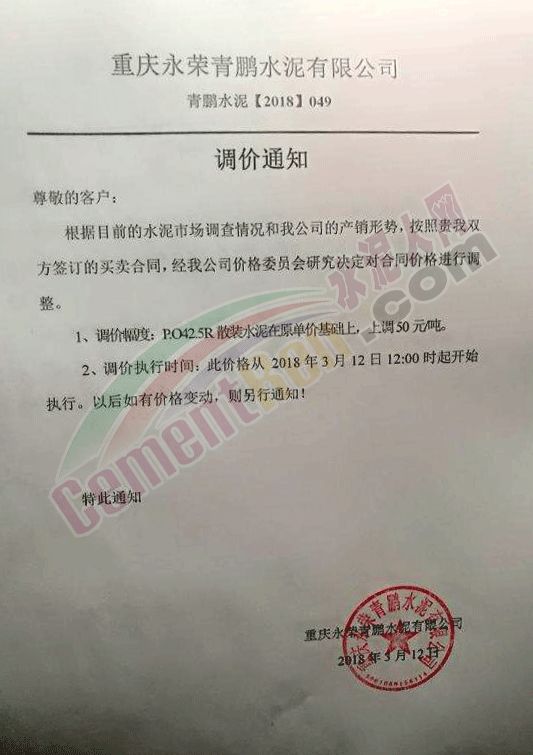 3月12日,重慶永榮青鵬水泥有限公司通知針對同重慶市不同地區(qū)水泥價(jià)格上調(diào)10-50元/噸。