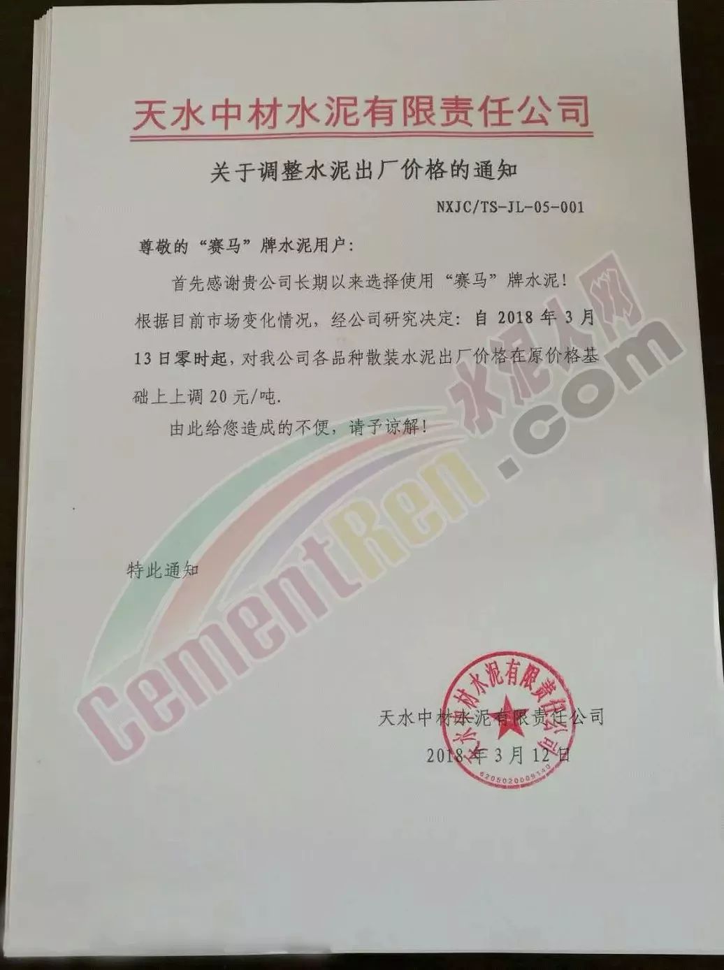 3月12日天水中材水泥有限責(zé)任公司通知自3月13日起上調(diào)旗下“賽馬”牌水泥出廠價(jià)格20元/噸。