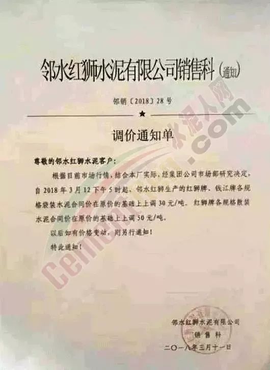 3月11日鄰水紅獅水泥有限公司銷售科發(fā)布調(diào)價(jià)通知自3月12日下午5時(shí)起上調(diào)旗下紅獅牌、錢江牌各規(guī)格袋裝水泥價(jià)格30元/噸,紅獅牌各規(guī)格散裝水泥上調(diào)50元/噸。