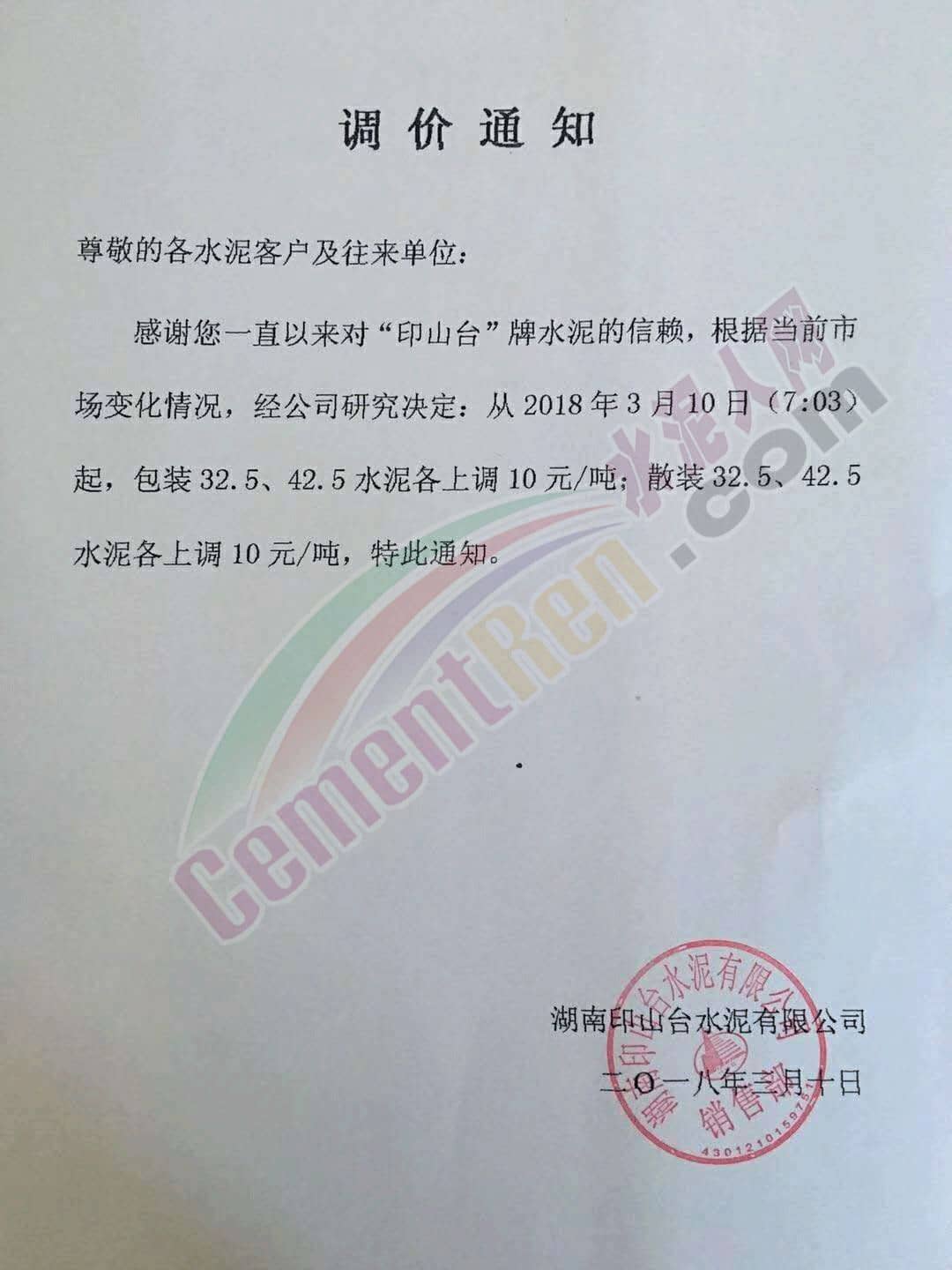 3月10日湖南區(qū)域印山臺水泥有限公司通知自3月10日起對旗下各規(guī)格水泥價(jià)格上調(diào)10元/噸。