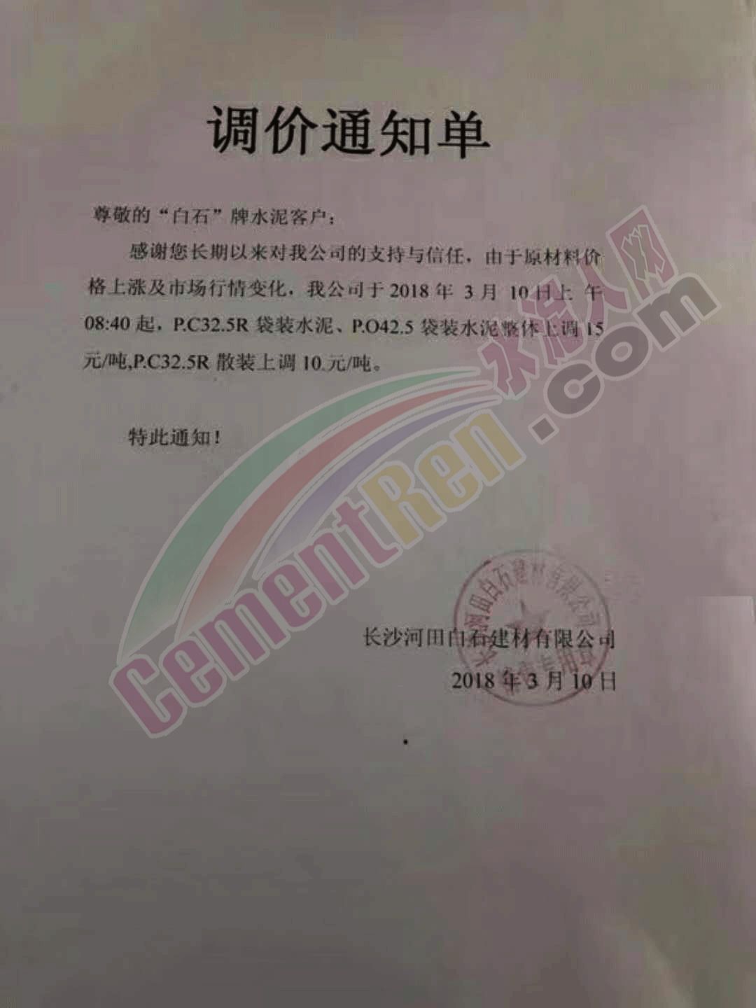 長沙河田白石建材有限公司通知3月10日起對旗下袋裝水泥整體上調(diào)15元/噸,P.C32.5R散裝水泥上調(diào)10元/噸。