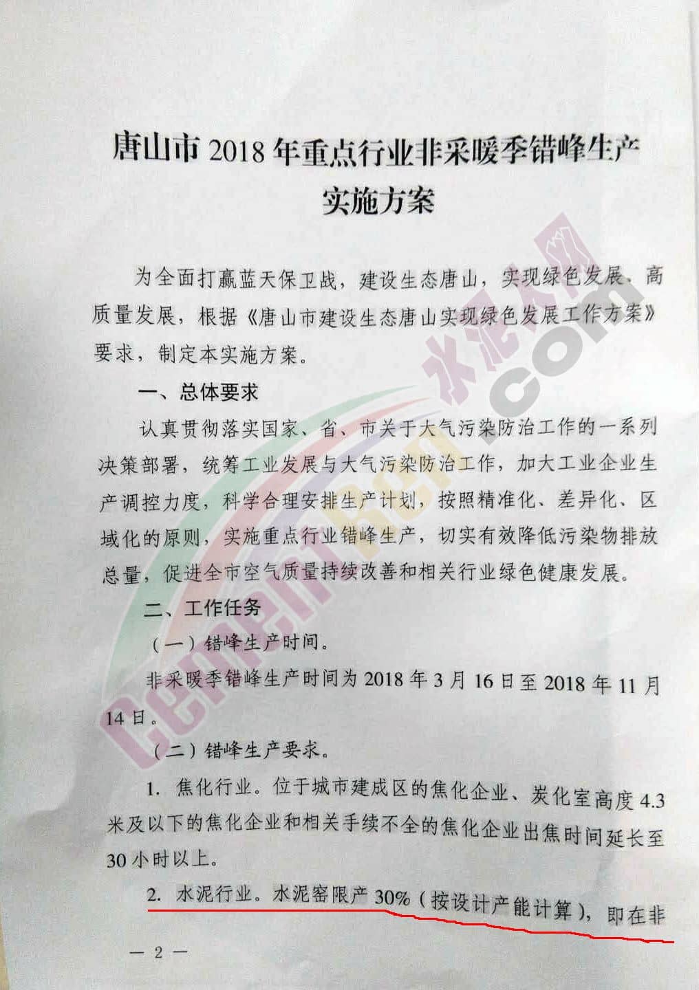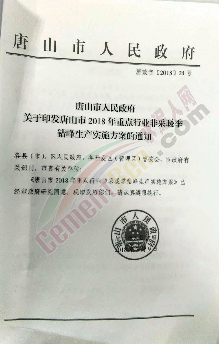 【水泥人網(wǎng)】日前,唐山市人民政府發(fā)布《唐山市2018年重點行業(yè)非采暖季錯峰生產(chǎn)實施方案》,方案要求水泥等重點行業(yè)在非采暖季執(zhí)行錯峰生產(chǎn)任務,錯峰生產(chǎn)時間為2018年3月16日至2018年11月14日。
