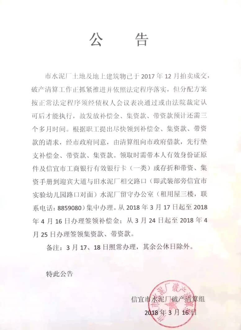根據(jù)有關(guān)法律、法規(guī),清算組對(duì)水泥廠破產(chǎn)后的職工補(bǔ)償情況等進(jìn)行了調(diào)查,并列出職工補(bǔ)償清單于2017年12月21日予以公示和核對(duì)。