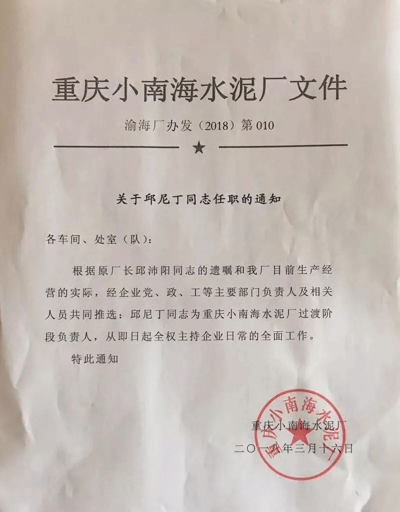【水泥人網(wǎng)】2018年03月16日,重慶小南海水泥廠廠辦發(fā)布(2018)第010文件:根據(jù)原廠長邱沛陽同志的遺囑,并結(jié)合本廠目前生產(chǎn)經(jīng)營的實際情況,經(jīng)本廠黨、政、工等主要部門負(fù)責(zé)人及相關(guān)人員共同推選,由邱尼丁同志擔(dān)任重慶小南海水泥廠過渡階段負(fù)責(zé)人,全權(quán)主持企業(yè)日常的全面工作。