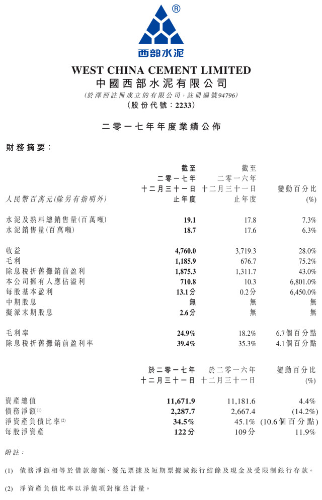 業(yè)績好轉(zhuǎn)主要由于期間整體水泥價格較2016年上升,導致收益增加。該年度的水泥平均售價為每噸248元,而2016年則為每噸207元。