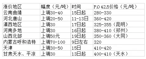正當(dāng)市場還在消化和觀察近日漲價通知落實情況時,20日,有風(fēng)聲傳出東北地區(qū)或25-27日推漲水泥價格100-150元/噸。東北地區(qū)調(diào)整后42.5散裝水泥出廠掛牌提至450-500元。