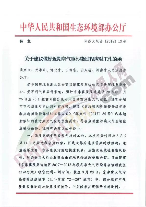 公函文件稱,預(yù)計京津冀及周邊地區(qū)2018年3月25日28日左右可能現(xiàn)4天區(qū)域重污染天氣過程,且部分城市空氣質(zhì)量可能達(dá)到嚴(yán)懲污染。建議北京市、天津市、河北省、山西省、山東省、河南省等高度重視重污染天氣應(yīng)對工作。