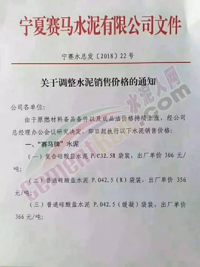 水泥人網(wǎng)通訊員消息,近期寧夏地區(qū)多家企業(yè)也發(fā)布了調(diào)價(jià)通知,其中區(qū)域主導(dǎo)企業(yè)賽馬水泥調(diào)價(jià)通知稱:由于原燃材料備品備件以及成品油價(jià)格持續(xù)上漲,經(jīng)公司總經(jīng)理辦公室會(huì)議研究決定,即日起公司旗下“賽馬”牌、“雙鹿”牌執(zhí)行新發(fā)布價(jià)格。寧東分廠出廠的各品種水泥出廠價(jià)以此基礎(chǔ)上再上調(diào)10元/噸。調(diào)價(jià)通知如下: