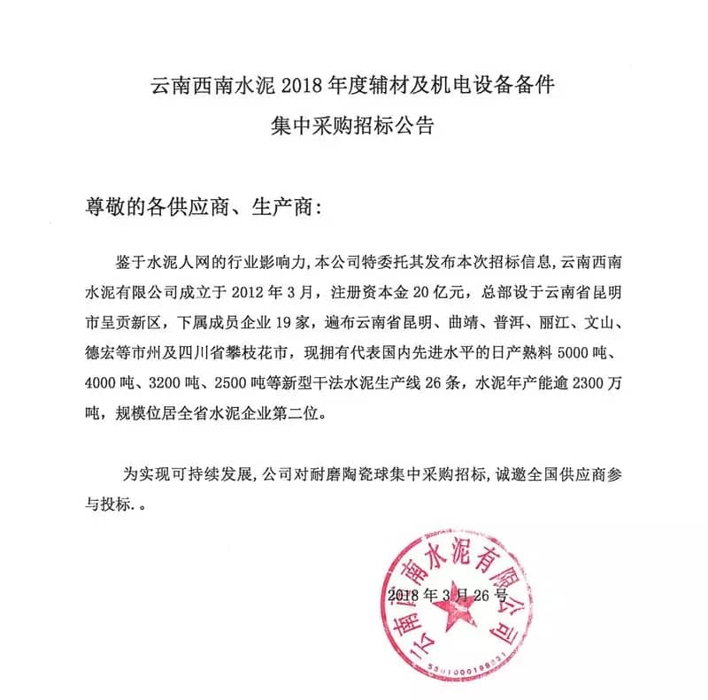 為了做好云南西南下屬19家成員企業(yè)2018年度生產用陶瓷耐磨球的招議標采購工作,誠邀云南西南下屬19家成員企業(yè)的機電設備原制造供貨廠及其他同類制造企業(yè)參加,以滿足云南西南下屬成員企業(yè)生產的機電設備備件及輔助材料的需求,共同打造云南西南長期穩(wěn)定合作、互惠共贏的供應商渠道。現(xiàn)將相關招標采購信息發(fā)布如下: