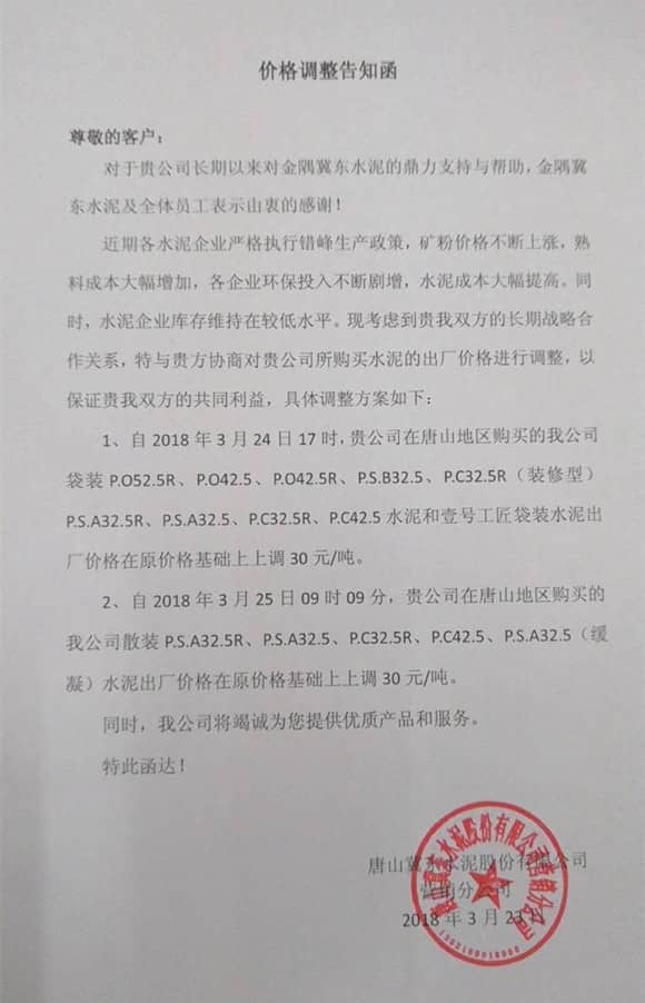 自2018年3月25日09時(shí)09分,金隅冀東唐山地區(qū)散裝P.S.A32.5R、P.S.A32.5、P.C32.5R、P.C42.5、P.S.A32.5(緩凝)水泥出廠價(jià)格在原價(jià)格基礎(chǔ)上上調(diào)30元/噸。