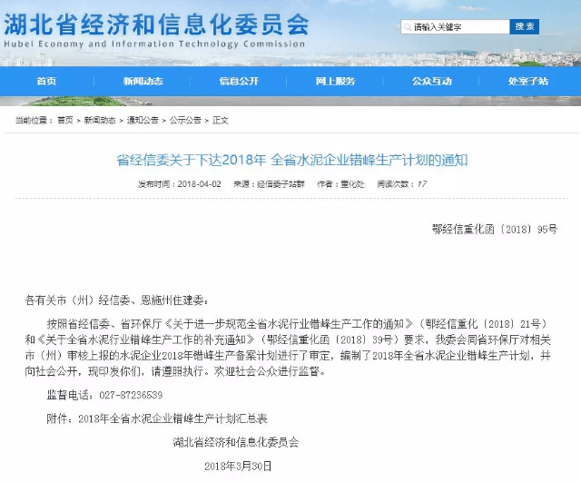 【水泥人網(wǎng)】日前,湖北省經(jīng)信委下發(fā)《關(guān)于2018年全省水泥企業(yè)錯(cuò)峰生產(chǎn)計(jì)劃的通知》,通知稱(chēng)按照省經(jīng)信委、省環(huán)保廳《關(guān)于進(jìn)一步規(guī)范全省水泥行業(yè)錯(cuò)峰生產(chǎn)工作的通知》(鄂經(jīng)信重化〔2018〕21號(hào))和《關(guān)于全省水泥行業(yè)錯(cuò)峰生產(chǎn)工作的補(bǔ)充通知》(鄂經(jīng)信重化函〔2018〕39號(hào))要求,湖北省工信委會(huì)同省環(huán)保廳對(duì)相關(guān)市(州)審核上報(bào)的水泥企業(yè)2018年錯(cuò)峰生產(chǎn)備案計(jì)劃進(jìn)行了審定,編制了2018年全省水泥企業(yè)錯(cuò)峰生產(chǎn)計(jì)劃,并向社會(huì)公開(kāi)。