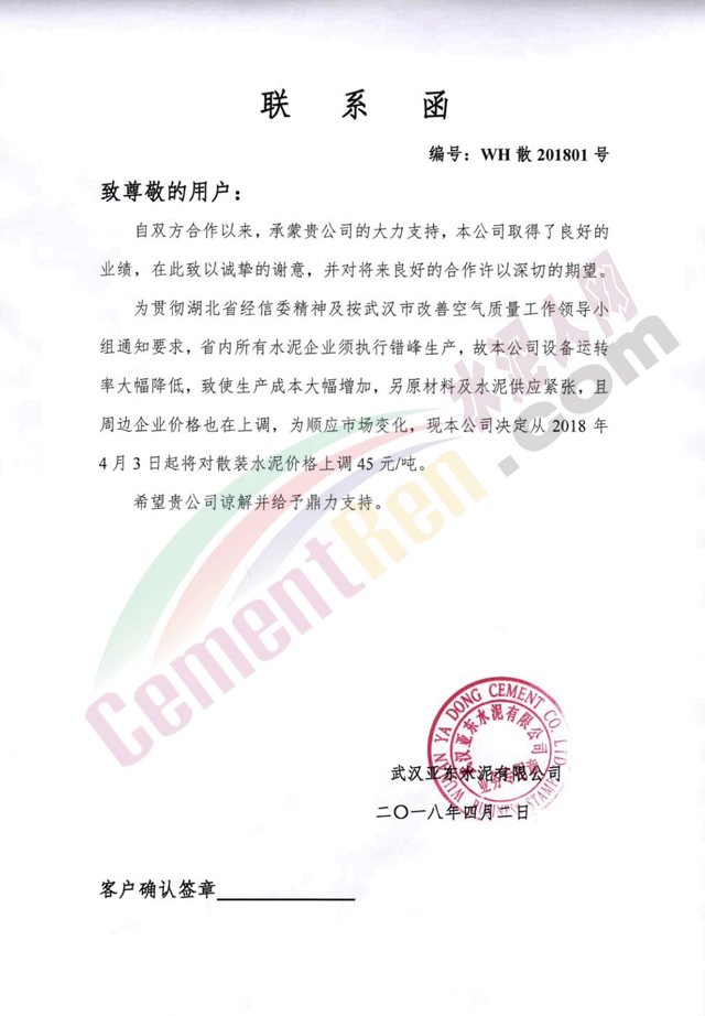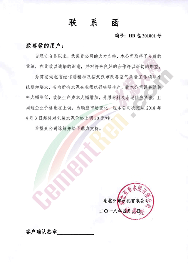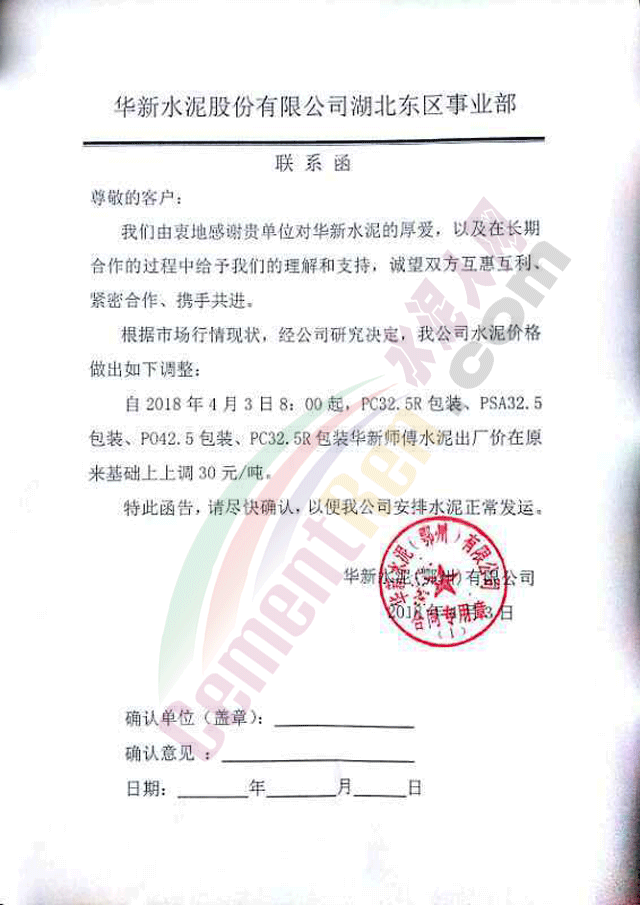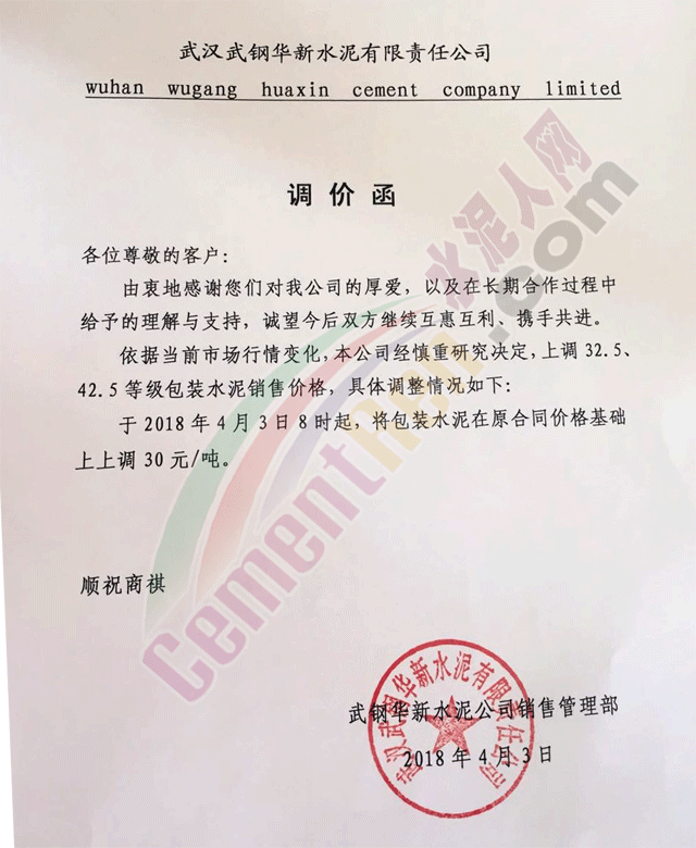 隨著錯(cuò)峰生產(chǎn)計(jì)劃發(fā)布,湖北武漢周邊區(qū)域的華新水泥、亞?wèn)|水泥、媧石水泥、三峽水泥等企業(yè)發(fā)通知上調(diào)水泥價(jià)格,其中袋裝水泥上調(diào)30元/噸,散裝水泥上調(diào)45元/噸。調(diào)價(jià)函如下: