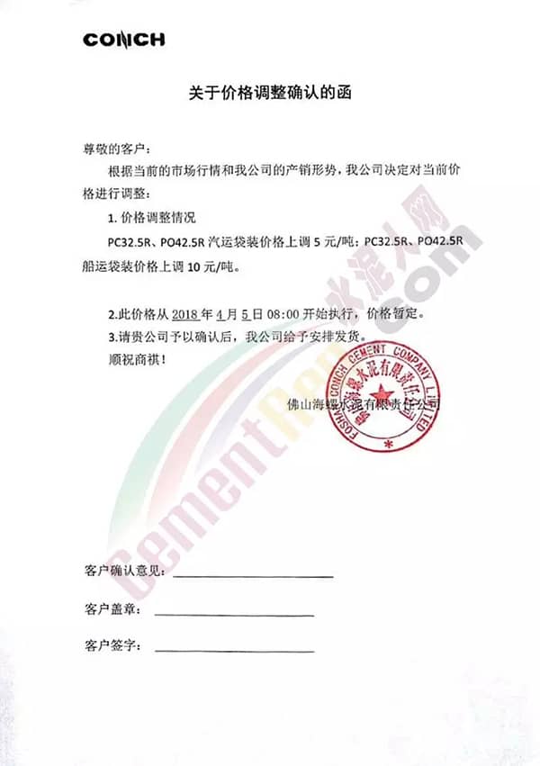 佛山海螺水泥調(diào)價函