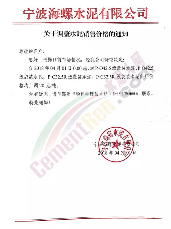 寧波海螺水泥調(diào)價通知