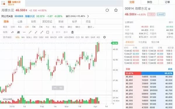 水泥價格上漲帶來了股市的好消息,4月6日海螺水泥(00914.HK)股價明顯上漲。盤中最高漲至46.85港元(約38元人民幣),刷新歷史創(chuàng)新高。