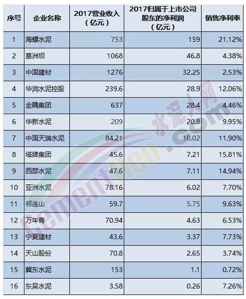 以上16家企業(yè)按上年?duì)I業(yè)收入排名計(jì)算,中國建材2017年?duì)I業(yè)收入1276億元排名第一,按銷售凈利率計(jì)算中國建材卻排在第15位。海螺水泥2017年?duì)I業(yè)收入753億元,在以上16家企業(yè)中排名第三位。
