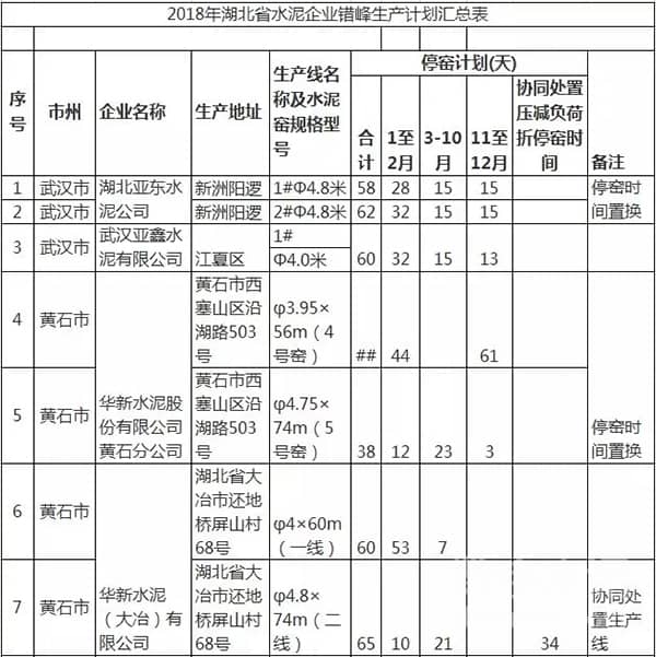 湖北省經(jīng)信委關(guān)于下達(dá)2018年全省水泥企業(yè)錯(cuò)峰生產(chǎn)計(jì)劃的通知
