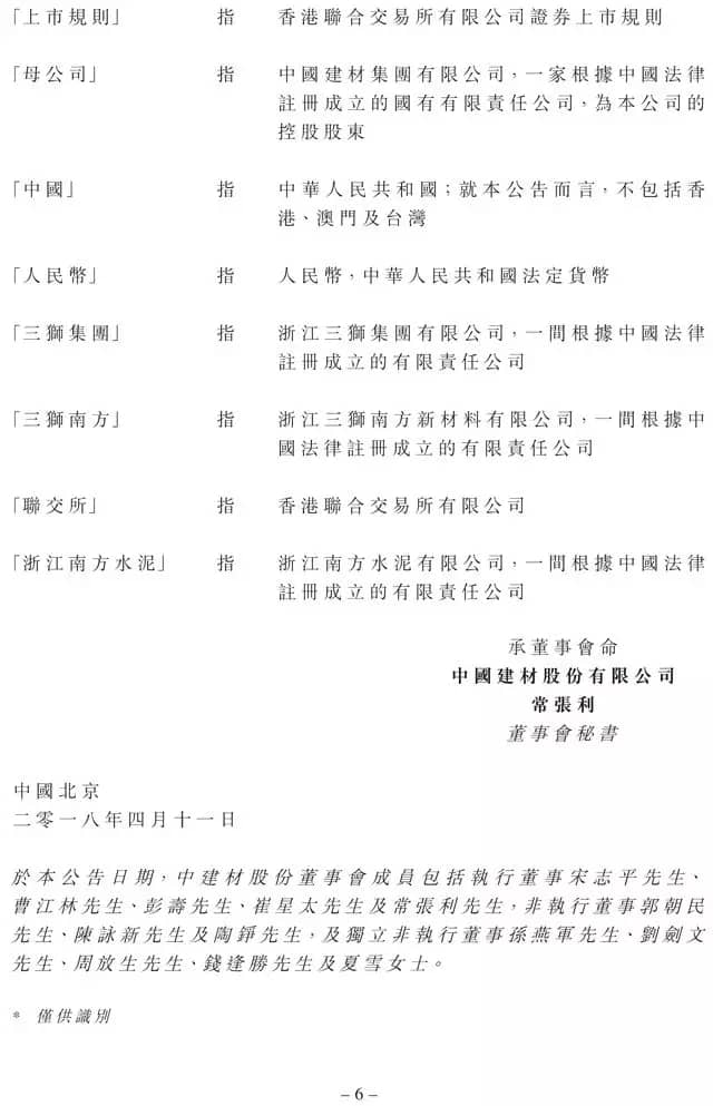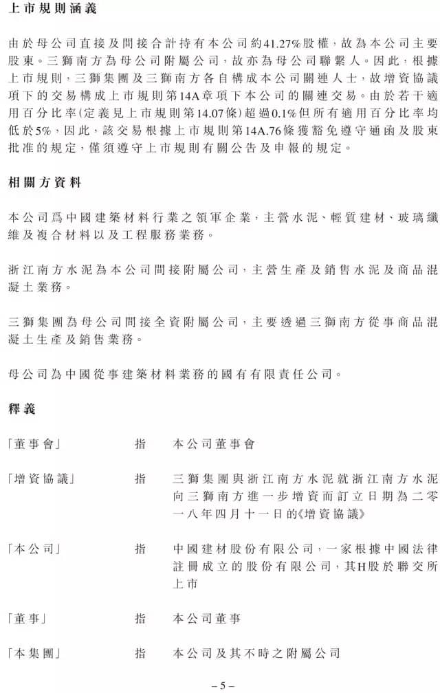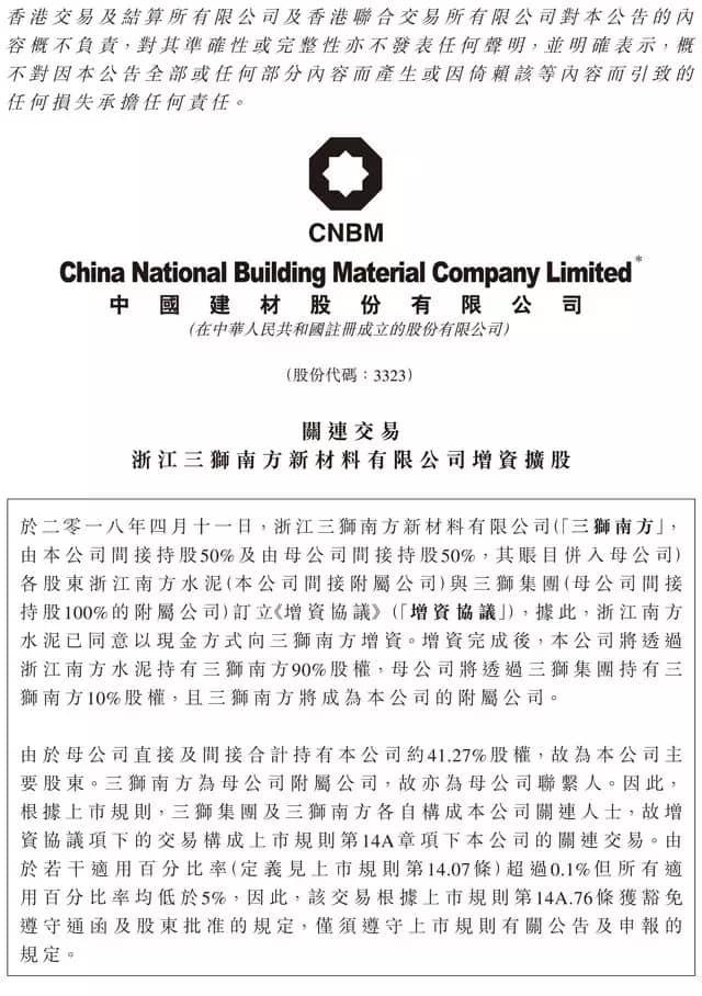 中國建材(9.29, -0.12, -1.27%)(03323)公布,2018年4月11日,由公司間接持股50%、母公司間接持股50%的浙江三獅南方新材料有限公司(“三獅南方”)訂立增資協(xié)議,據(jù)此,公司附屬浙江南方水泥以現(xiàn)金方式向三獅南方增資。其中,新增注冊(cè)資本人民幣6.4億元,資本公積金出資人民幣約2.34億元。