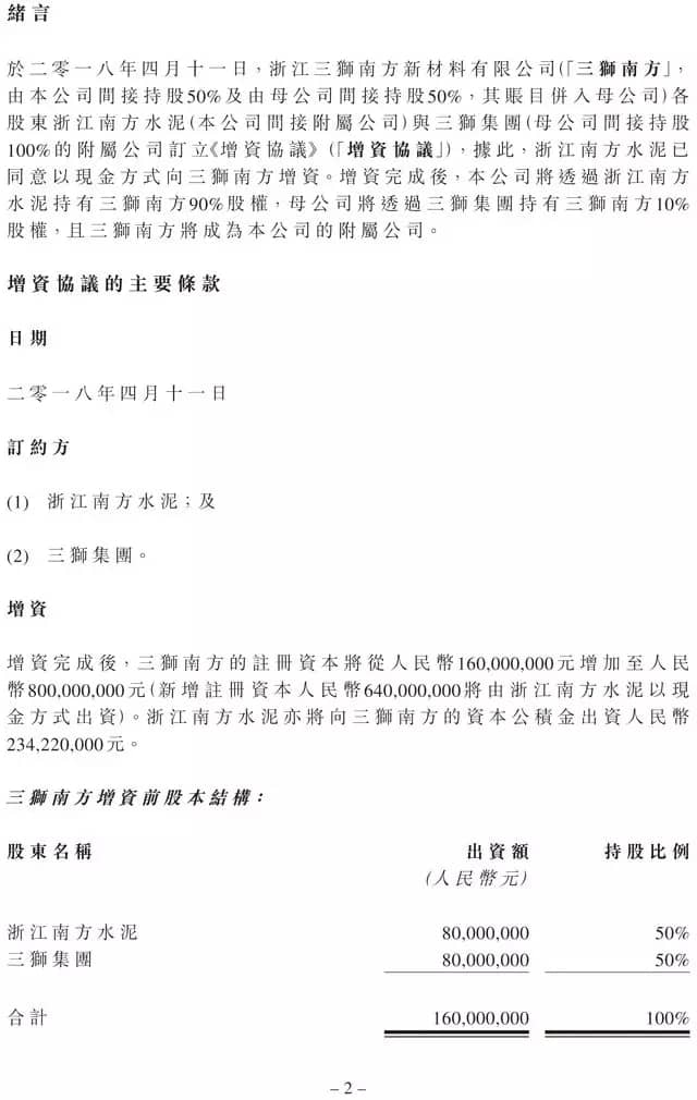 增資完成后,公司透過浙江南方水泥持有三獅南方90%股權(quán),母公司透過三獅集團(tuán)持有三獅南方10%股權(quán),且三獅南方成為公司的附屬公司。