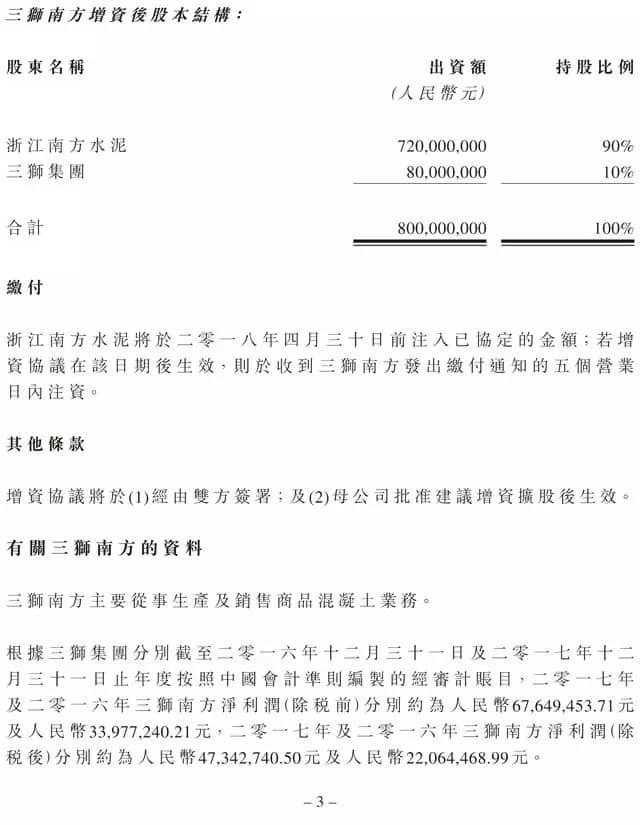 公告顯示,三獅南方主要從事生產(chǎn)及銷售商品混凝土業(yè)務(wù)。截至2016年、2017年12月31日止年度按照中國會(huì)計(jì)準(zhǔn)則編制的經(jīng)審計(jì)賬目,其稅前凈利潤分別約人民幣6764.9萬元及3397.7萬元,稅后凈利潤分別約人民幣4734.27萬元及2206.45萬元。