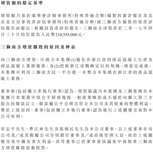 向三獅南方增資,可助力集團(tuán)優(yōu)化在浙江省的商品混凝土生產(chǎn)及商品混凝土業(yè)務(wù)運(yùn)營;及把握浙江省戰(zhàn)略定位的契機(jī)。增資完成后,集團(tuán)可利用三獅南方這一平臺(tái),進(jìn)一步整合集團(tuán)在浙江省的商品混凝土業(yè)務(wù)。
