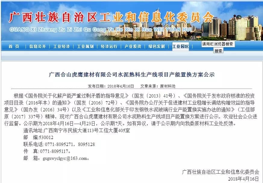 【水泥人網(wǎng)】日前,廣西壯族自治區(qū)工信委公布了《廣西合山虎鷹建材有限公司水泥熟料生產(chǎn)線項目產(chǎn)能置換方案》公示稱: 根據(jù)《國務(wù)院關(guān)于化解產(chǎn)能嚴(yán)重過剩矛盾的指導(dǎo)意見》(國發(fā)〔2013〕41號)、《國務(wù)院關(guān)于發(fā)布政府核準(zhǔn)的投資項目目錄(2016年本)的通知》(國發(fā)〔2016〕72號)、《國務(wù)院辦公廳關(guān)于促進(jìn)建材工業(yè)穩(wěn)增長調(diào)結(jié)構(gòu)增效益的指導(dǎo)意見》(國辦發(fā)〔2016〕34號)以及《工業(yè)和信息化部關(guān)于印發(fā)鋼鐵水泥玻璃行業(yè)產(chǎn)能置換實施辦法的通知》(工信部原〔2017〕337號)精神,對廣西合山虎鷹建材有限公司水泥熟料生產(chǎn)線項目產(chǎn)能置換方案進(jìn)行公示,歡迎社會公眾進(jìn)行監(jiān)督。公示期為2018年4月16日—4月23日,公示期7天。公示原文如下: