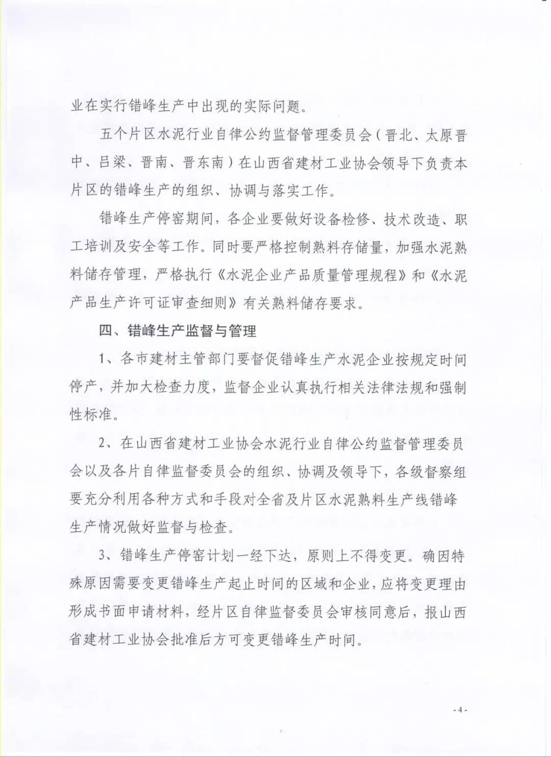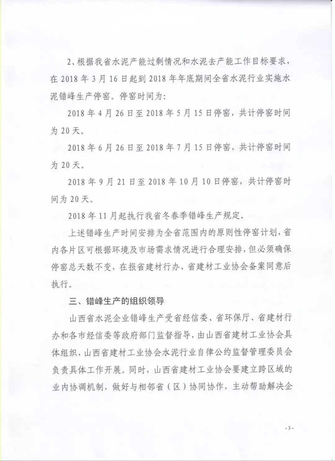 【水泥人網(wǎng)】據(jù)水泥人網(wǎng)了解,山西省根據(jù)產(chǎn)能過(guò)剩實(shí)際情況和水泥去產(chǎn)能工作目標(biāo)的要求,在2018年3月16日起到2018年年底期間全省水泥行業(yè)實(shí)施錯(cuò)峰生產(chǎn)停窯,停窯時(shí)間為: