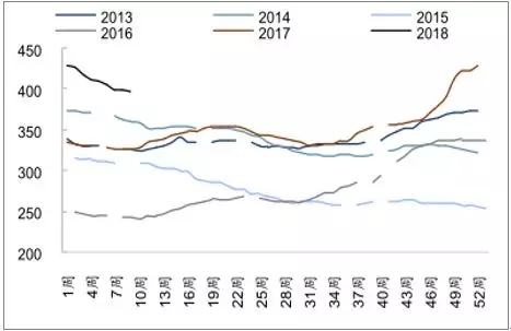 水泥年初以來價格出現(xiàn)季節(jié)性走弱,主要集中于華東、中南以及西南地區(qū),其余地區(qū)價格仍然維持高位堅挺,截至3月2日,全國高標水泥平均報價 398.33元/噸,較去年同期高 21.88%,仍處于歷史高位水平。前期價格下降主要原因為,一方面南方雨雪天氣導致,下游需求減弱,另一方面為組織沿江地區(qū)進口熟料的增加,近期主要由于春節(jié)因素,下游企業(yè)尚未開工,生產(chǎn)商通過價格下調(diào)打開市場銷量,刺激開工后下游采購的積極性。根據(jù)過去數(shù)年春節(jié)前后水泥價格波動規(guī)律的比較可以明顯看出,農(nóng)歷春節(jié)后,水泥市場價格仍將持續(xù)一段時間的低迷,待開工恢復后才出現(xiàn)回暖,因此近期個別區(qū)域價格仍有下探現(xiàn)象,屬正常。
