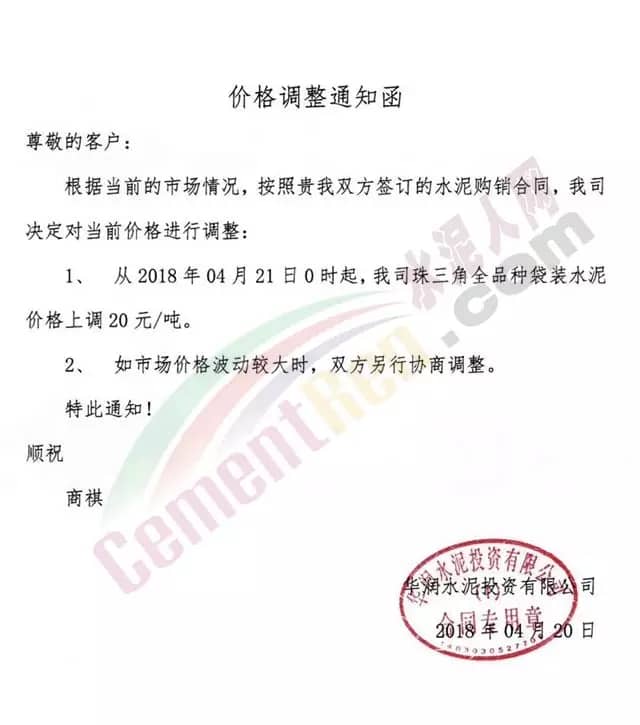 華潤(rùn)水泥(投資)有限公司發(fā)布價(jià)格調(diào)整通知函,通知珠三角區(qū)域客戶,自今日(21日)起全品種袋裝水泥價(jià)格上調(diào)20元/噸。